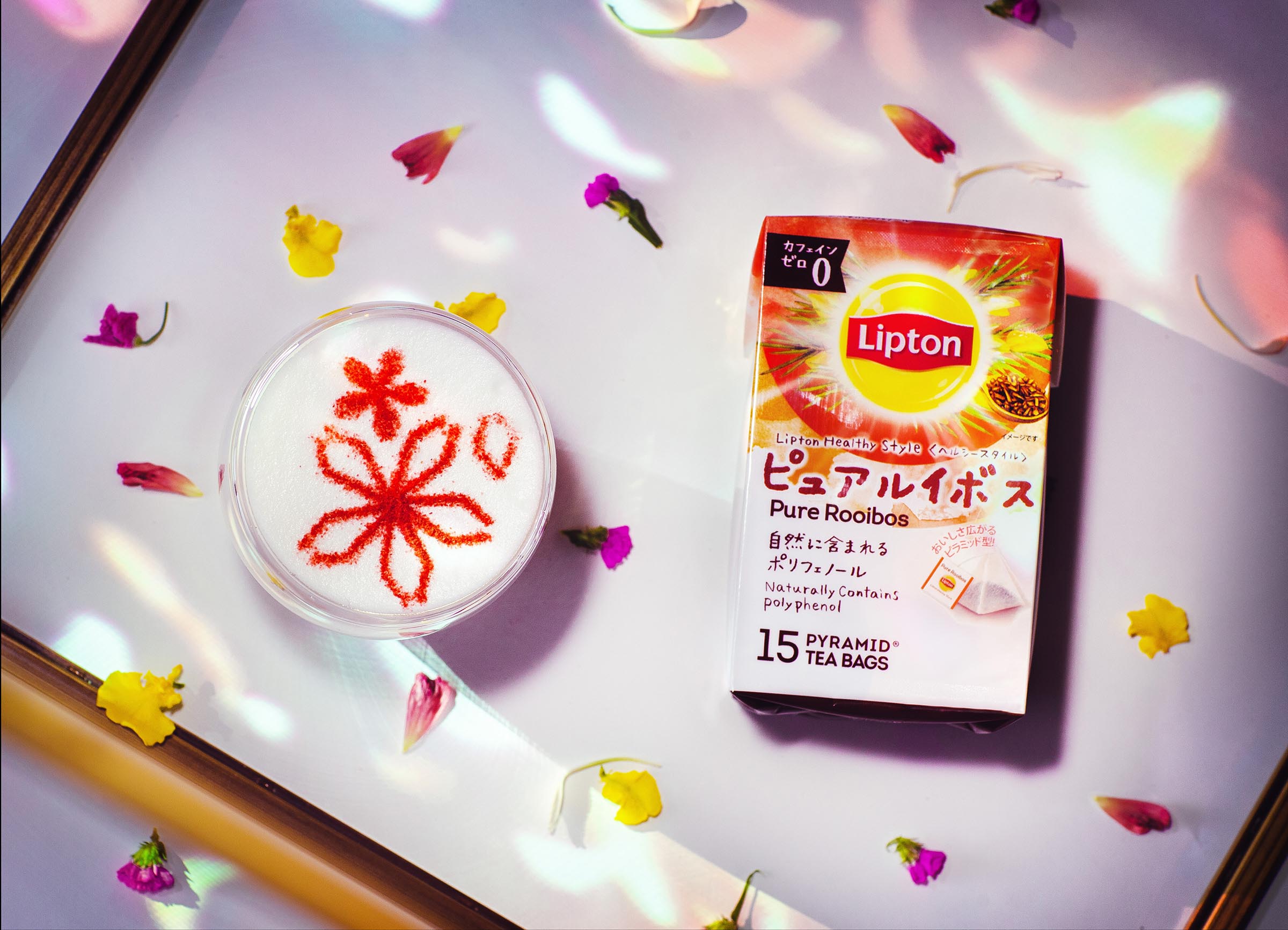 自然な甘みとやさしい味わいの「リプトン ヘルシースタイル ピュアルイボス」に、寒い季節にぴったりな「ミルクフォーム」と「ストロベリーパウダー」をトッピングした春にぴったりのラテティー。ヘルシー思考の方やカフェインが気になる方にもおすすめのホットティーです。